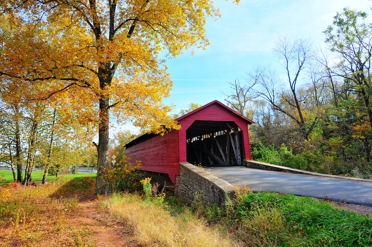 Located in the Mingo Creek County Park, this iconic covered bridge features a bright red exterior and is still used today.